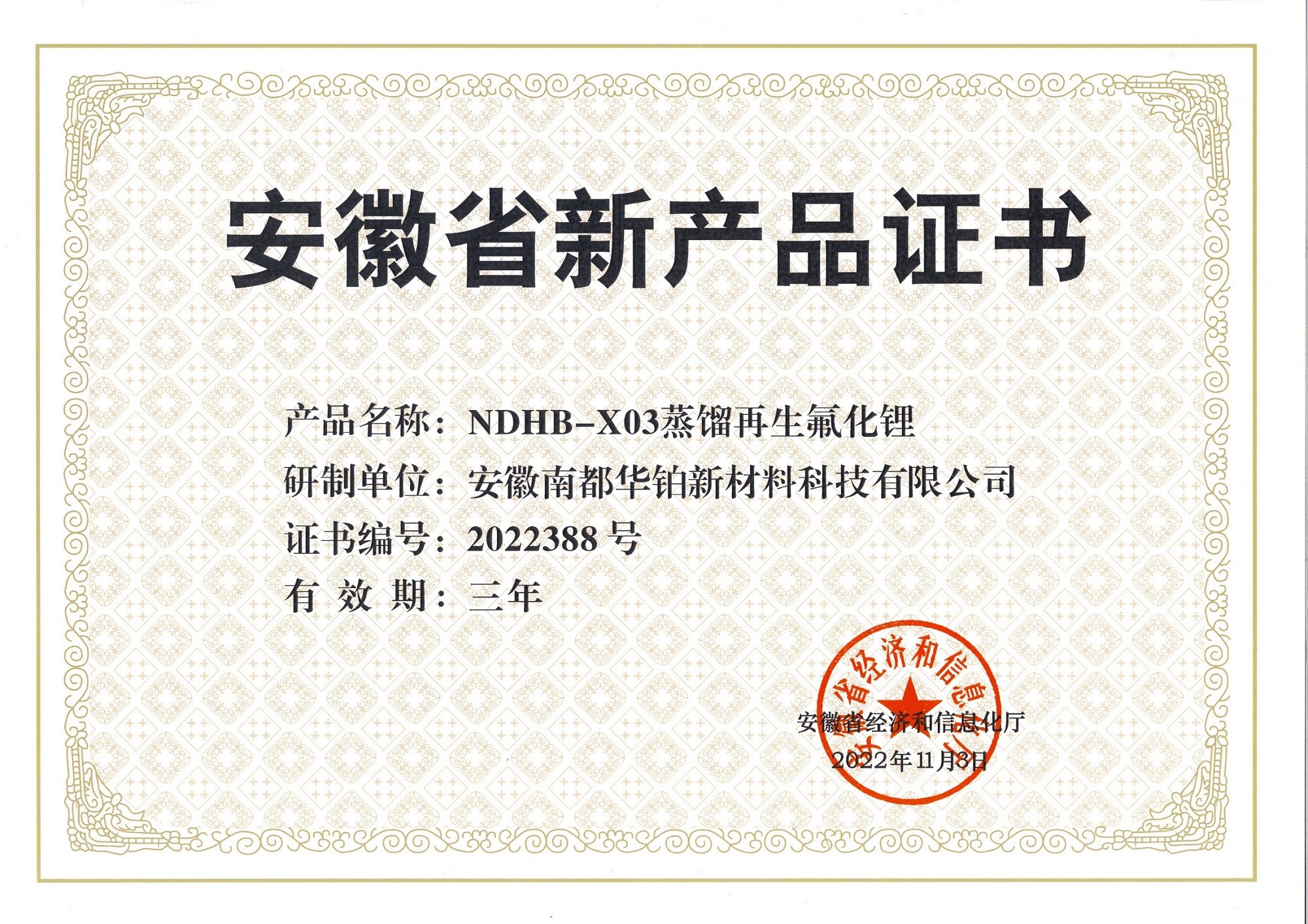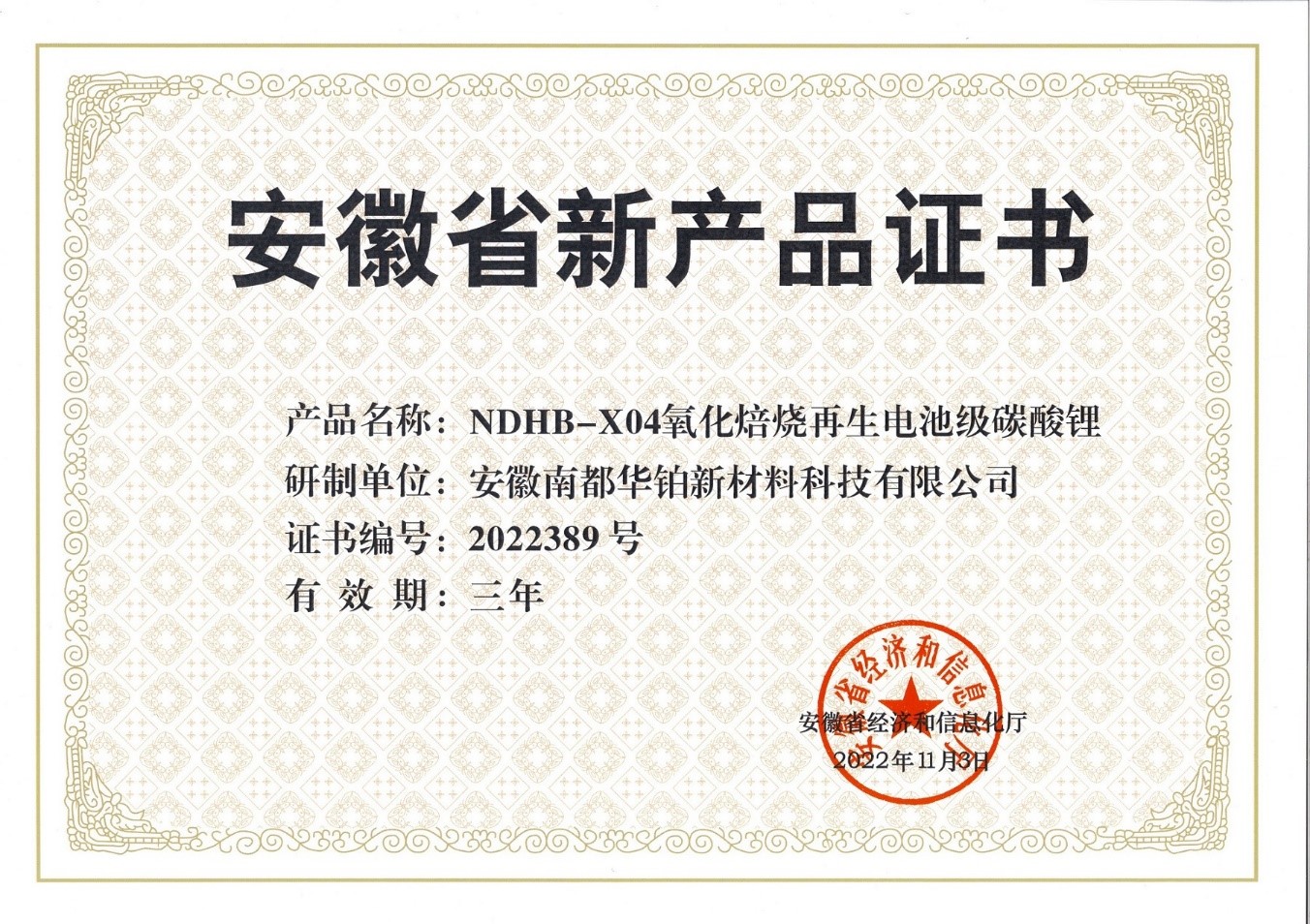 "NDHB-X04 Oxidation Roasting Regeneration Battery Grade Lithium Carbonate" and "NDHB-X03 Distillation Regeneration Potassium Fluoride" developed by Narada Huabo were awarded by the Anhui Provincial Department of Economy and Information Technology as "Anhui Provincial New Product Certificate".